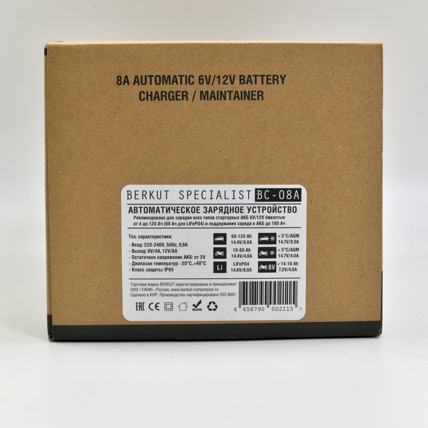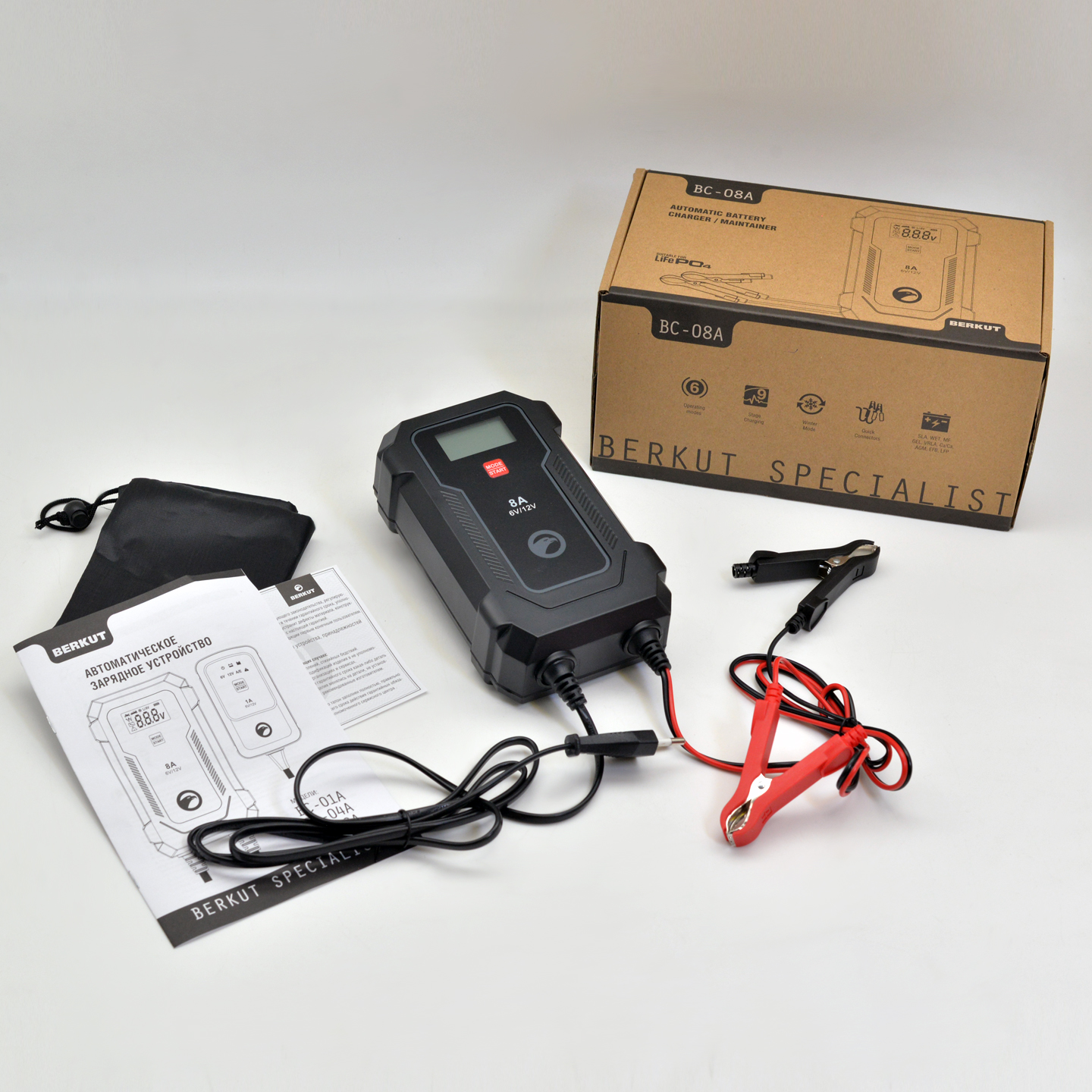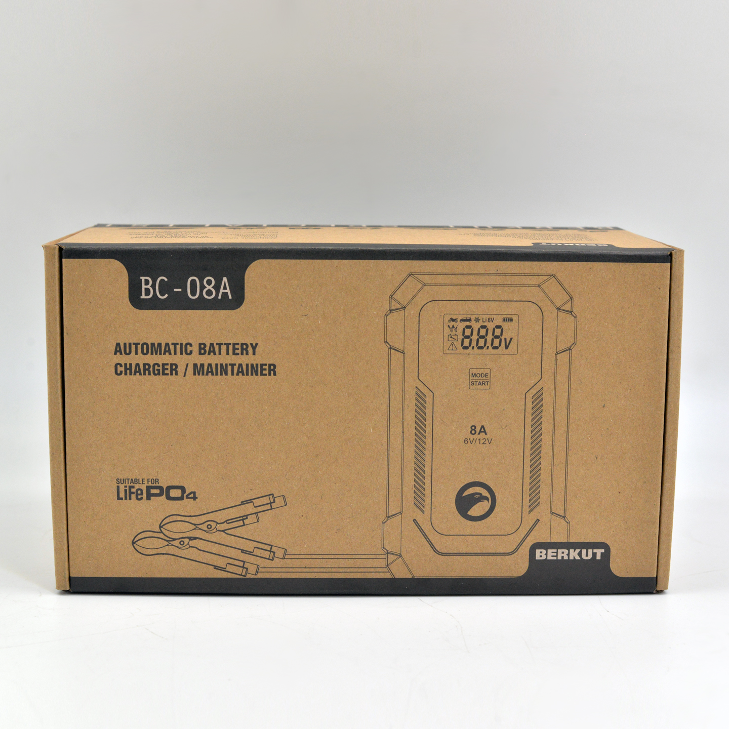 Зарядное устройство BERKUT BC-08A — полностью автоматическое устройство, предназначенное для обслуживания и зарядки 6 и 12-Вольтовых аккумуляторных батарей емкостью от 4 до 120 Ач, используемых в мото- и садовой техники и т.п. Устройство является полностью автоматическим и имеет поэтапный поэтапным алгоритмом зарядки в 9 стадий.