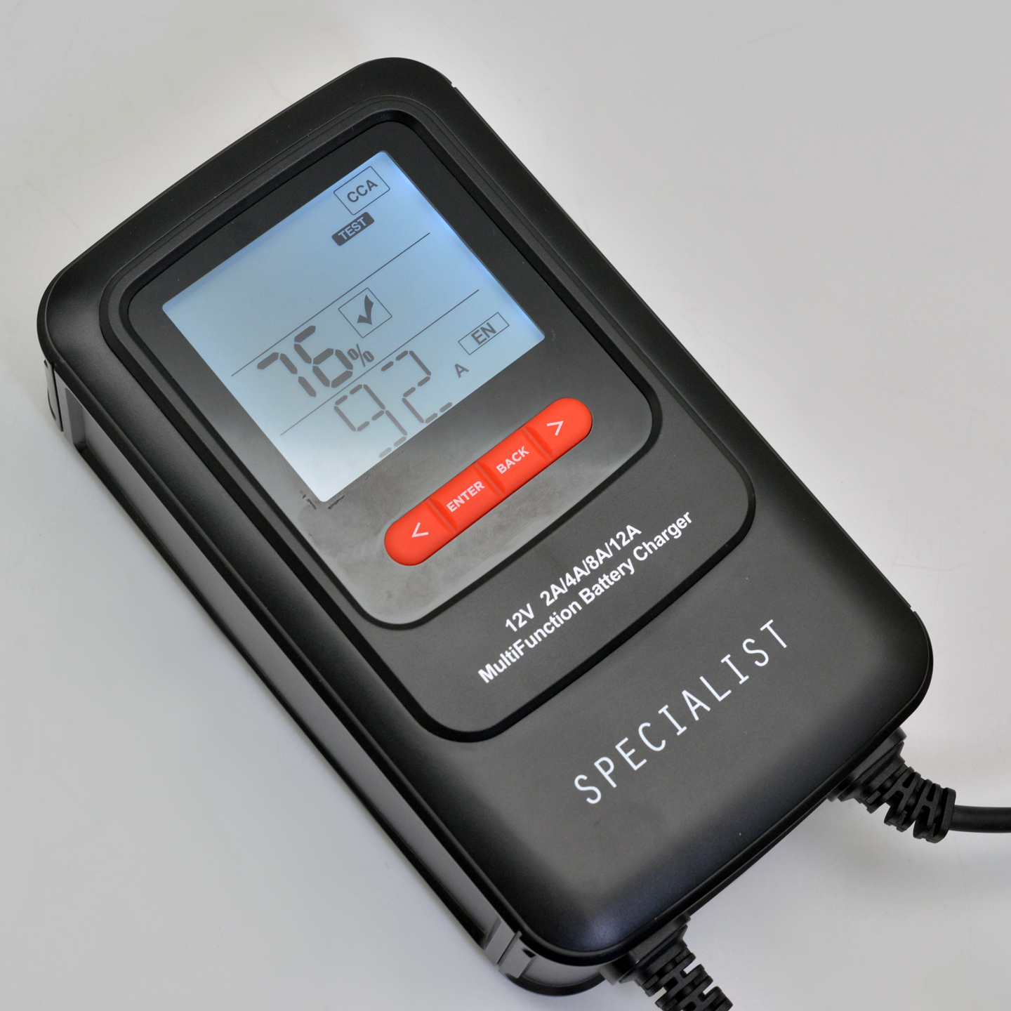 Теперь пользователь может запустить все процессы диагностики как перед началом зарядки, так и по ее окончании и получить полную картину о состоянии своей АКБ — устройство снабжено многофункциональным ЖК-дисплеем, по которому можно оценить состояние батареи, уровень заряда и пусковых характеристик, а также замерить напряжение от генератора.